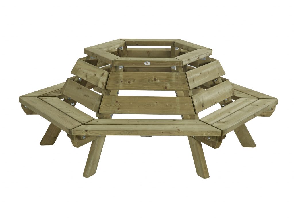 Degelijke houten boombank in zeshoekige vorm. De boombank is gemaakt van Noord-Europees naaldhout met FSC®-keurmerk. Het hout is per onderdeel onder druk en KOMO-keur geïmpregneerd. Een oerdegelijke constructie en rondom splintervrije afwerking zorgen voor een zorgeloos gebruik. De boombank kan altijd recht om de boom worden geplaatst doordat de poten schuin bij de boom vandaan staan. Bovenop de rugleuning is een brede rand bevestigd waar bijvoorbeeld een tijdschrift op weggelegd of wat drinken op gezet kan worden. Een boombank wordt meestal om een bestaande boom gemonteerd, levering vindt dan ook plaats in bouwpakket. De montage is al wel grotendeels vergemakkelijkt doordat rugleuningen en zittingen al gemonteerd zijn.