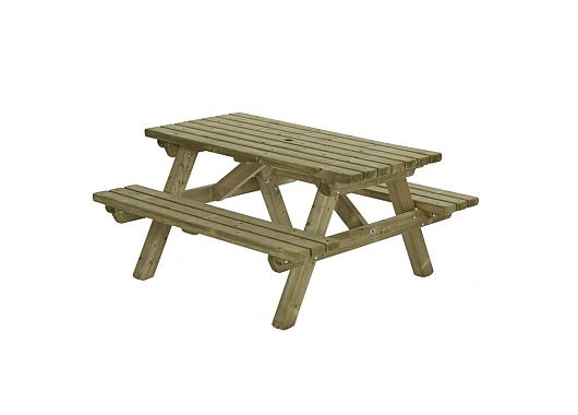 Een ideale picknicktafel voor het geval dat er beperkte ruimte beschikbaar is, met een compacte afmeting van 150x150cm is er toch voldoende plaats voor vier volwassenen. De picknicktafel is robuust uitgevoerd in Noord-Europees naaldhout voorzien van het FSC®-keurmerk. Een perfecte afwerking doordat het hout per onderdeel wordt bewerkt, waarbij alle gezaagde uiteinden worden geschuurd. Deze picknicktafel is gemaakt om jarenlang gebruik van te kunnen maken, wordt compleet gemonteerd afgeleverd en is voorzien van een parasolopening.
