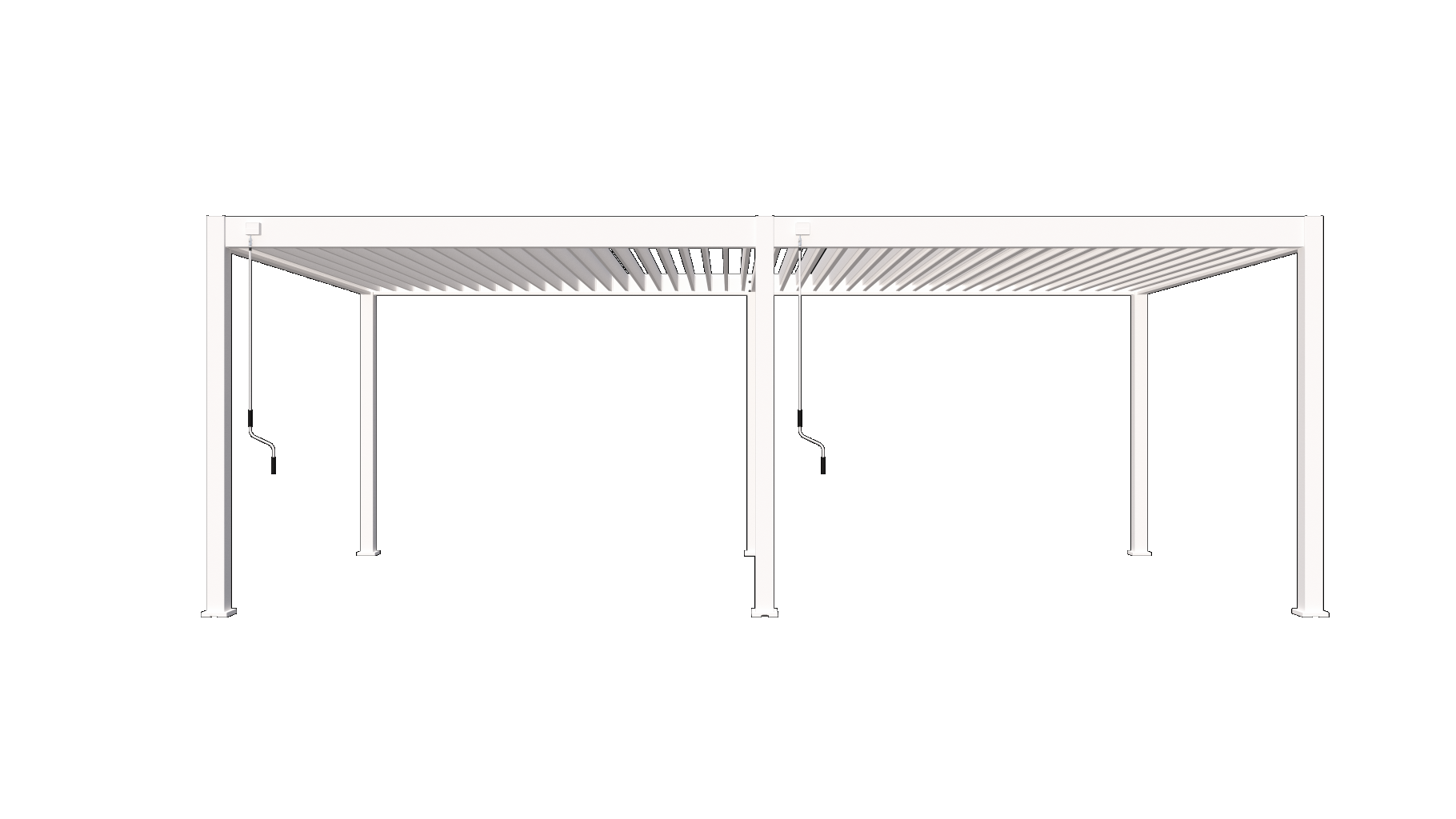 Gebaseerd op ons ontwerpconcept om de uitstraling nooit te verwaarlozen, hebben we aan twee zijden de bovenrail aan de bovenkant van de balken toegevoegd. Daarna zal het verbindingsdeel tussen de verbindingsstaven en lamellen onzichtbaar zijn tijdens het draaien van de lamellen, en zo verkrijg je een pergola met een glad en strak frame.