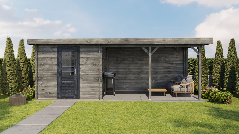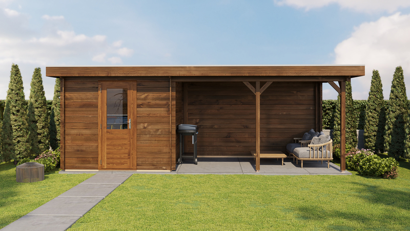 Lugarde Select Blokhut met overkapping 250x250cm + 400cm - Keteldruk Bruin - excl. EPDM - 28mm 1e klas gedroogd vurenhout - 18mm Dakplanken met veer en groef - Dubbelglas - Enkele Deur *rechtsdraaiend* met gelamineerd 4,5cm dik hout - Alle beslag en ijzerwaren inclusief