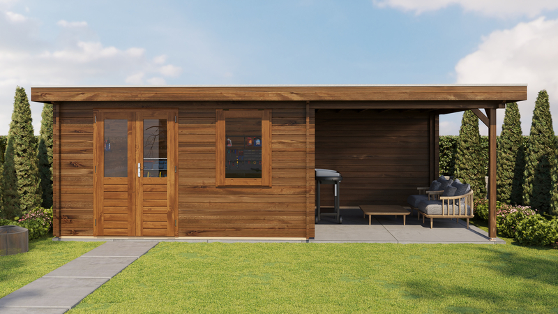 Lugarde Select Blokhut met overkapping 400x400cm + 300cm - Keteldruk Bruin - excl. EPDM - 44mm 1e klas gedroogd vurenhout - 18mm Dakplanken met veer en groef - Dubbelglas - Dubbele deur en uitzetraam met gelamineerd 4,5cm dik hout - Alle beslag en ijzerwaren inclusief