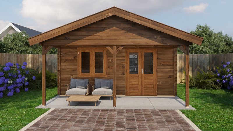 Lugarde Select Blokhut met overkapping 500x400cm + 200cm - Keteldruk Bruin - excl. SHINGLES - 44mm 1e klas gedroogd vurenhout - 18mm Dakplanken met veer en groef - Dubbelglas - Dubbele deur en dubbelraam met gelamineerd 4,5cm dik hout - Alle beslag en ijzerwaren inclusief