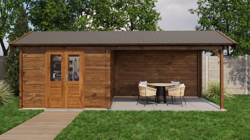 Lugarde Select Blokhut met overkapping 300x300cm + 400cm - Keteldruk Bruin - excl. SHINGLES - 28mm 1e klas gedroogd vurenhout - 18mm Dakplanken met veer en groef - Dubbelglas - Dubbele deur met gelamineerd 4,5cm dik hout - Alle beslag en ijzerwaren inclusief