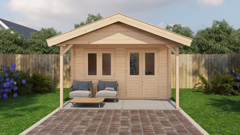 Lugarde Select Blokhut met overkapping 400x300cm + 200cm - Keteldruk Bruin - excl. SHINGLES - 44mm 1e klas gedroogd vurenhout - 18mm Dakplanken met veer en groef - Dubbelglas - Dubbele deur en dubbelraam met gelamineerd 4,5cm dik hout - Alle beslag en ijzerwaren inclusief