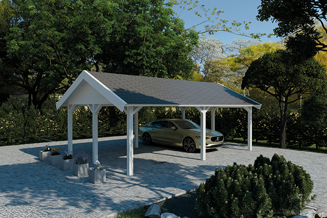 Carport CP6 is een dubbele carport die voldoende ruimte biedt om twee voertuigen tegelijk te stallen. Dit is bijzonder voordelig voor huishoudens met meerdere auto's of voor wie een deel van de ruimte wil gebruiken voor extra opslag. Het zadeldak zorgt ervoor dat regen, sneeuw en andere omgevingselementen er gemakkelijk vanaf glijden, waardoor schade aan je auto's door blootstelling aan het weer wordt voorkomen.