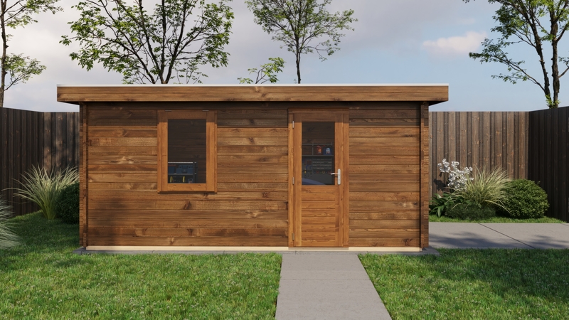 Lugarde Select Blokhut 350x500cm - Keteldruk Bruin - excl. EPDM - 44mm 1e klas gedroogd vurenhout - 18mm Dakplanken met veer en groef - Dubbelglas - Dubbele deur en uitzetraam met gelamineerd 4,5cm dik hout - Alle beslag en ijzerwaren inclusief + dubbele garagedeur