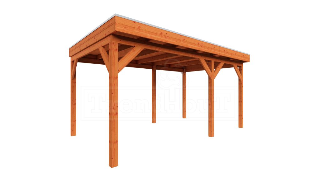 Dit buitenverblijf is als bouwpakket samengesteld en is standaard zonder wanden uitgevoerd.