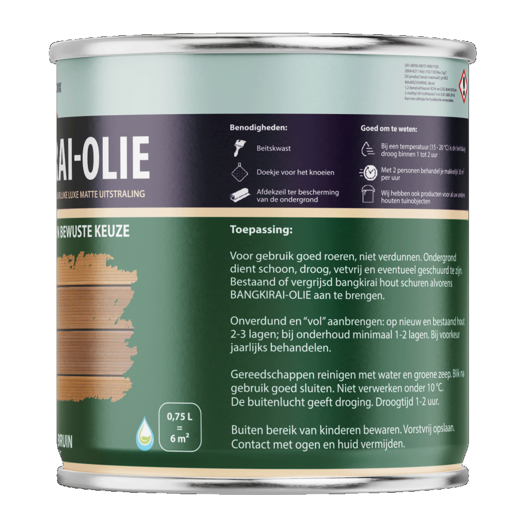 Bangkirai-Olie is speciaal ontwikkeld voor bangkirai hardhouten objecten in de tuin zoals: schuttingen, vlonders, pergola’s, plantenbakken en tuinmeubelen. De bijzondere samenstelling op basis van speciale oliën zorgt voor een goede indringing en hechting; bladderen is uitgesloten. Het natuurlijke karakter en de kleur van het hout blijft behouden. Na droging is het hout beschermd tegen weersinvloeden waardoor vergrijzing voorkomen wordt.