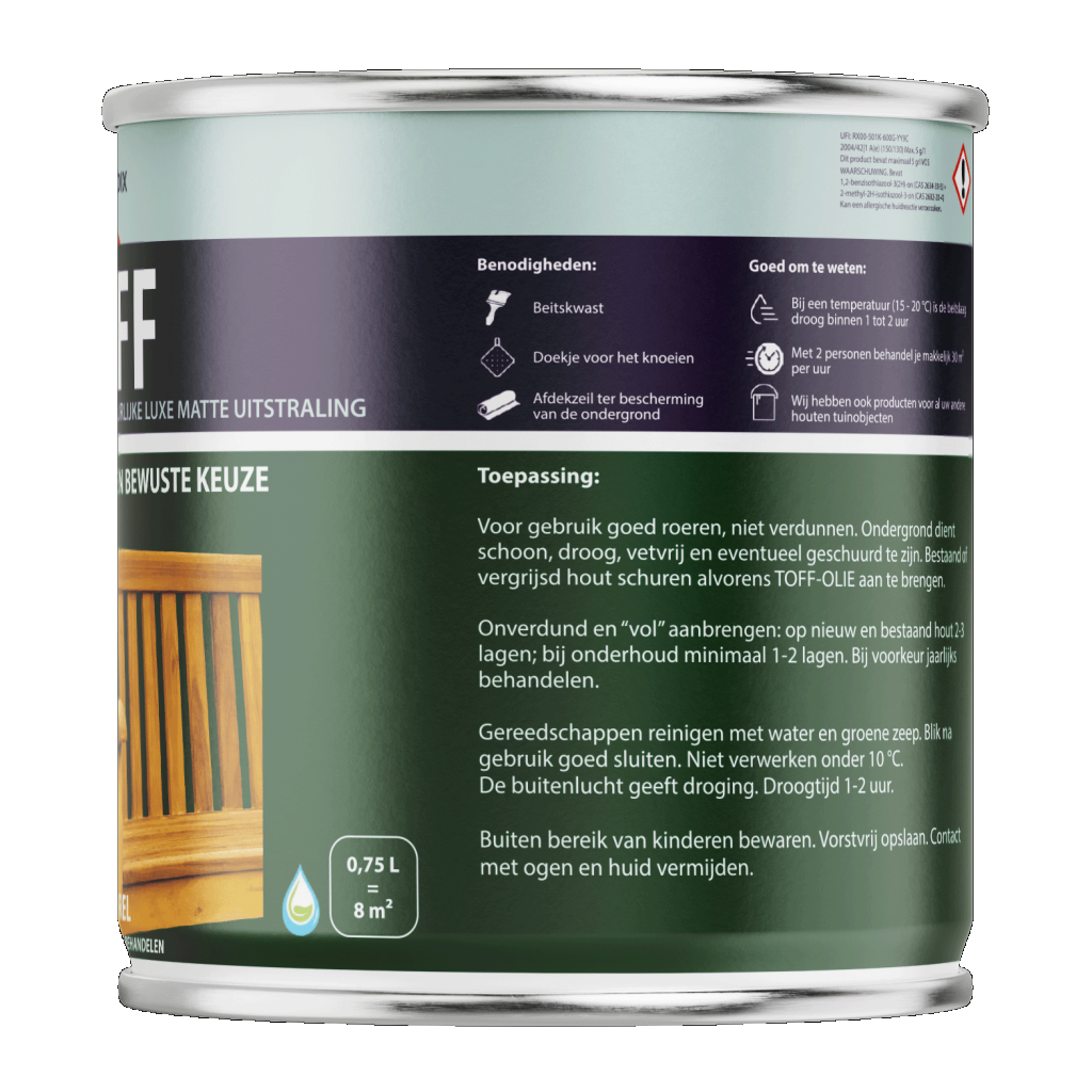 TOFF teakolie is speciaal ontwikkeld voor teakhouten tuinmeubelen. Echter ook geschikt voor andere hardhoutsoorten. De bijzondere samenstelling op basis van speciale oliën garandeert het behoud van het natuurlijke karakter van het kostbare teakhout. TOFF is waterafstotend en voorkomt vervuiling en vergrijzing. De behandeling, met name de liggende delen, enkele malen per jaar herhalen. Hiermee beschermt, onderhoudt en herstelt u het mooie teakhout.