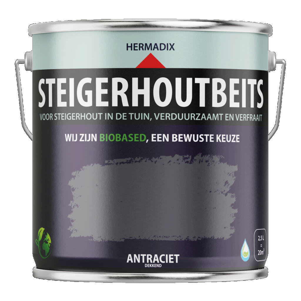 Hermadix Steigerhoutbeits antraciet is speciaal ontwikkeld voor nieuw en oud steigerhout. Het is een transparante beits die goed indringt in het hout.