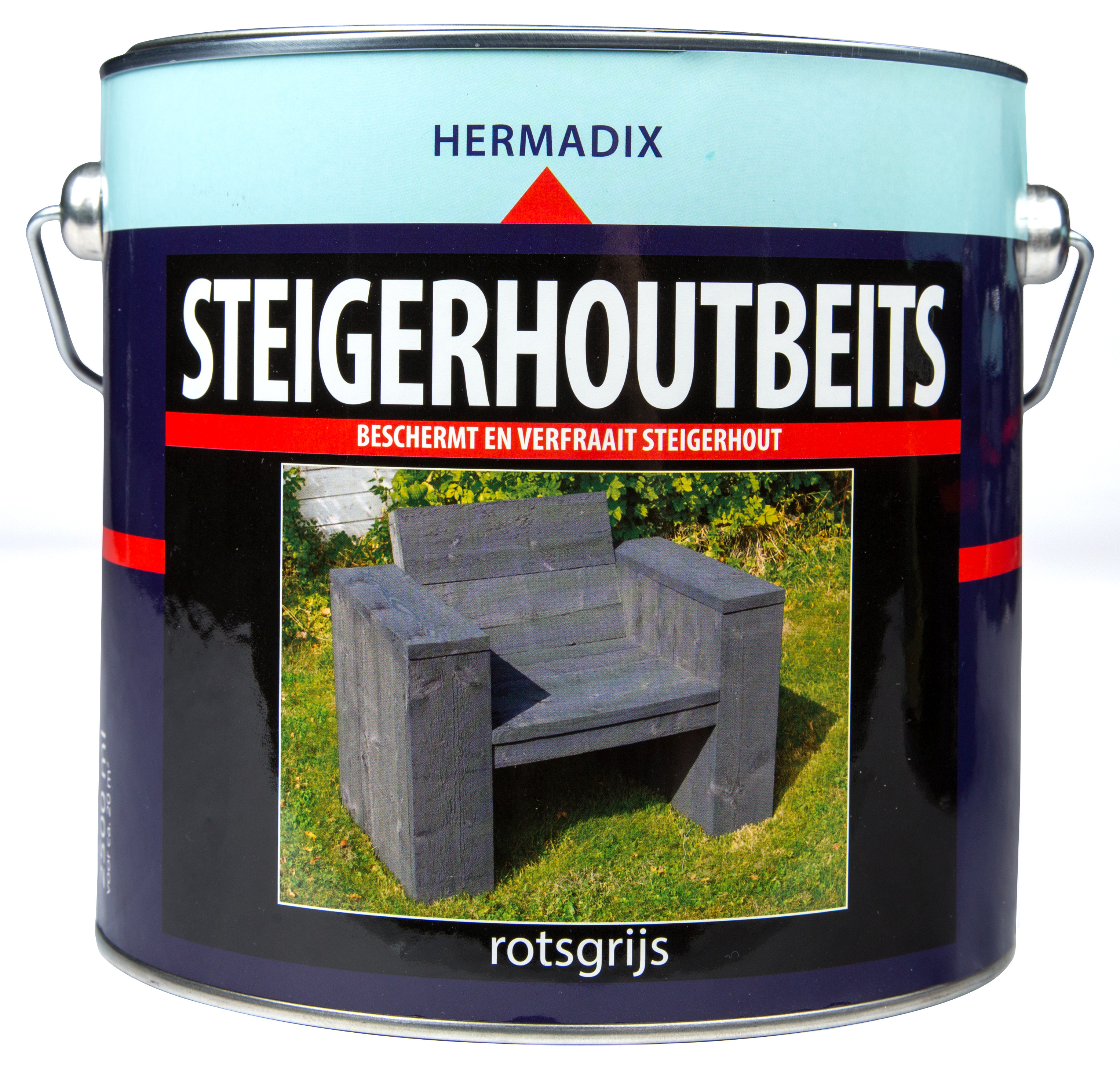 Hermadix Steigerhoutbeits rotsgrijs is speciaal ontwikkeld voor nieuw en oud steigerhout. Het is een transparante beits die goed indringt in het hout.
