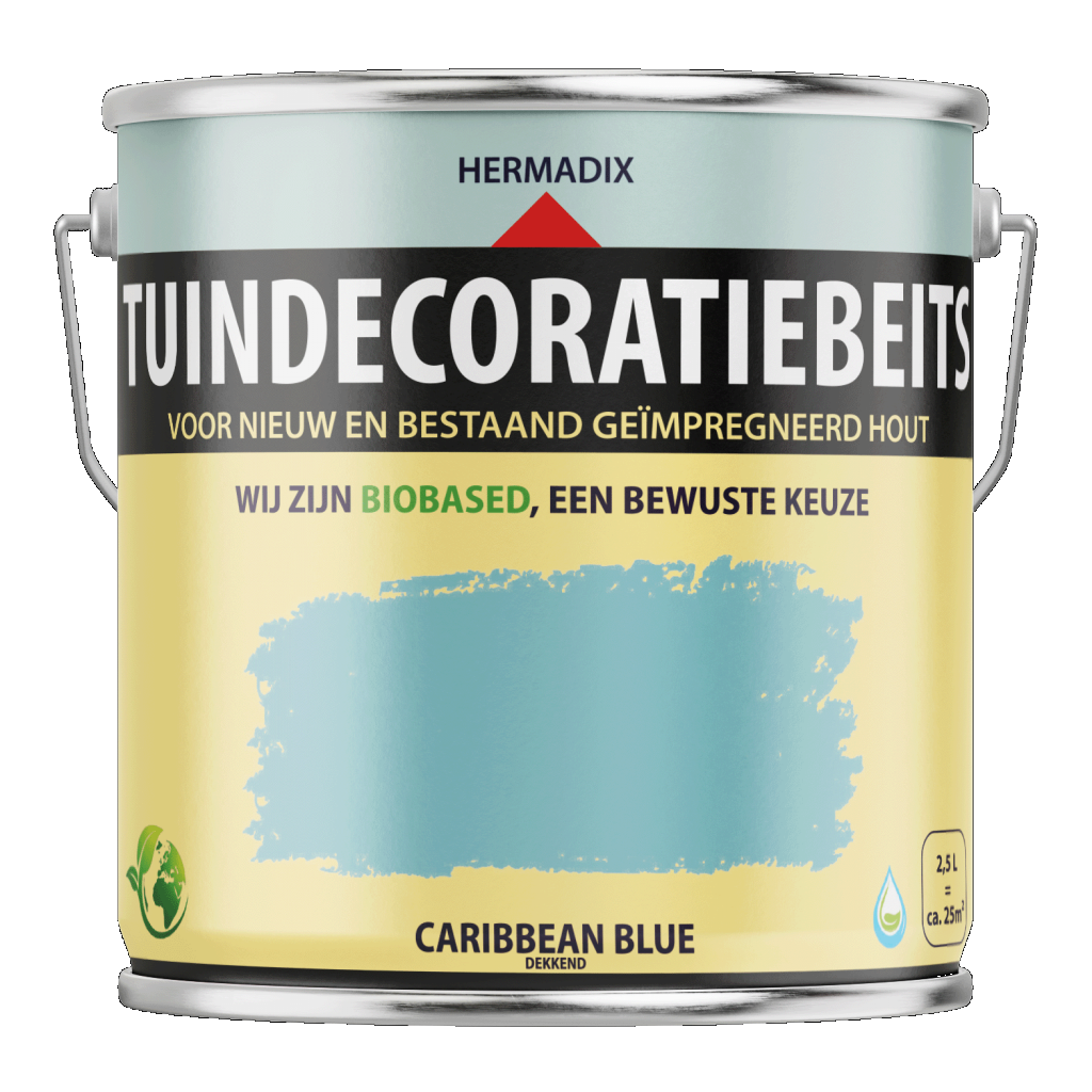 Hermadix Tuindecoratiebeits is speciaal ontwikkeld voor nieuw en oud geïmpregneerd tuinhout, zoals: schuttingen, speeltoestellen, borders, pergola en geïmpregneerde blokhutten. Nieuw geïmpregneerd tuinhout heeft een fabrieksmatige behandeling ondergaan. De speciale samenstelling van Tuindecoratiebeits is naadloos afgestemd op deze behandeling. Hierdoor kunt u uw tuinhout makkelijk en snel beitsen. Bij onderhoudslagen hoeft niet geschuurd te worden. Caribbean Blue is een matglanzende dekkende kleur en geeft een jarenlange bescherming en sfeervolle uitstraling. Tuindecoratiebeits is makkelijk te verwerken en sneldrogend.