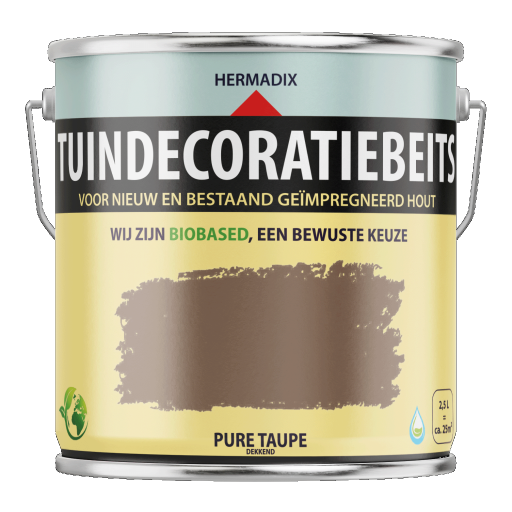 Hermadix Tuindecoratiebeits is speciaal ontwikkeld voor nieuw en oud geïmpregneerd tuinhout, zoals: schuttingen, speeltoestellen, borders, pergola en geïmpregneerde blokhutten. Nieuw geïmpregneerd tuinhout heeft een fabrieksmatige behandeling ondergaan. De speciale samenstelling van Tuindecoratiebeits is naadloos afgestemd op deze behandeling. Hierdoor kunt u uw tuinhout makkelijk en snel beitsen. Bij onderhoudslagen hoeft niet geschuurd te worden. Pure Taupe is een matglanzende dekkende kleur en geeft een jarenlange bescherming en sfeervolle uitstraling. Tuindecoratiebeits is makkelijk te verwerken en sneldrogend.
