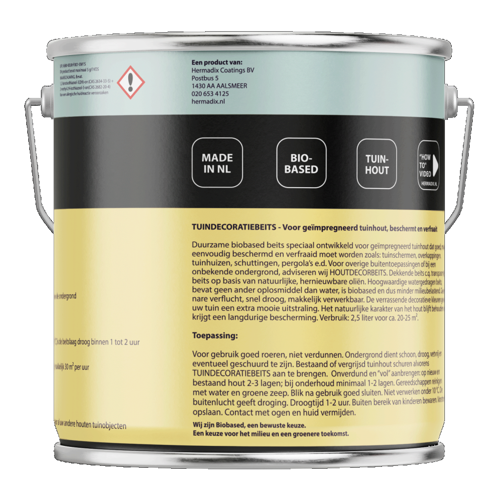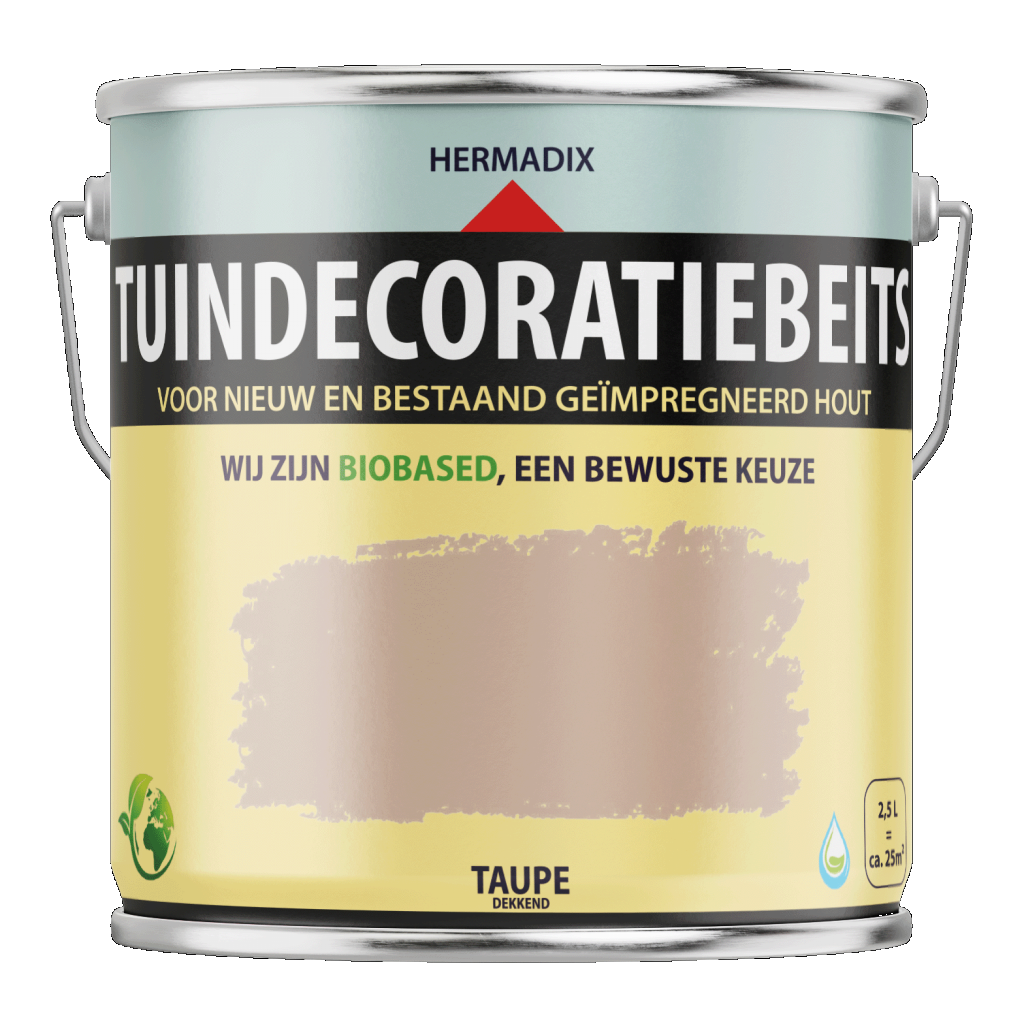 Hermadix Tuindecoratiebeits is speciaal ontwikkeld voor nieuw en oud geïmpregneerd tuinhout, zoals: schuttingen, speeltoestellen, borders, pergola en geïmpregneerde blokhutten. Nieuw geïmpregneerd tuinhout heeft een fabrieksmatige behandeling ondergaan. De speciale samenstelling van Tuindecoratiebeits is naadloos afgestemd op deze behandeling. Hierdoor kunt u uw tuinhout makkelijk en snel beitsen. Bij onderhoudslagen hoeft niet geschuurd te worden. Taupe is een matglanzende dekkende kleur en geeft een jarenlange bescherming en sfeervolle uitstraling. Tuindecoratiebeits is makkelijk te verwerken en sneldrogend.