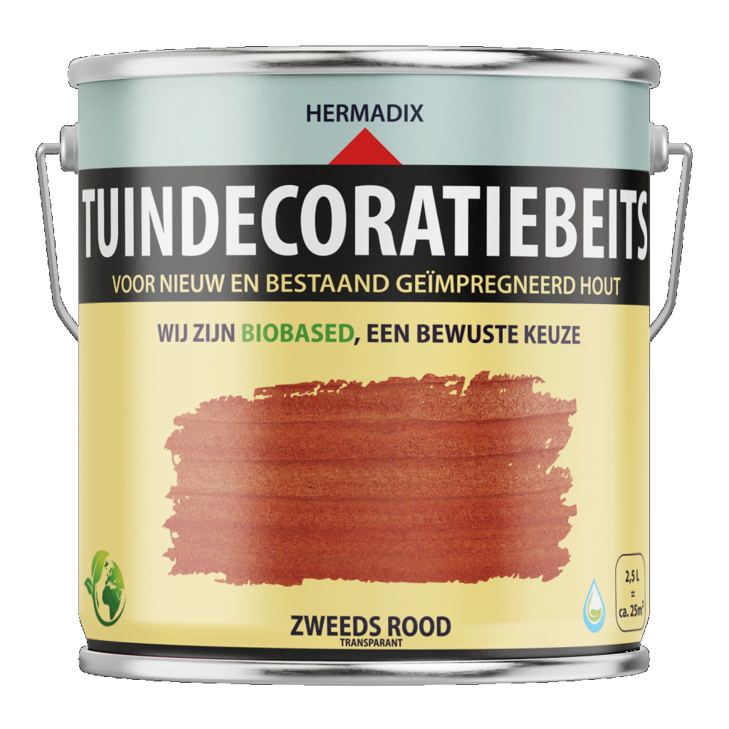 Hermadix Tuindecoratiebeits is speciaal ontwikkeld voor nieuw en oud geïmpregneerd tuinhout, zoals: schuttingen, speeltoestellen, borders, pergola en geïmpregneerde blokhutten. Nieuw geïmpregneerd tuinhout heeft een fabrieksmatige behandeling ondergaan. De speciale samenstelling van Tuindecoratiebeits is naadloos afgestemd op deze behandeling. Hierdoor kunt u uw tuinhout makkelijk en snel beitsen. Bij onderhoudslagen hoeft niet geschuurd te worden. Zweeds Rood is een transparante kleur en geeft een natuurlijke uitstraling waarbij de houtnerf zichtbaar blijft.