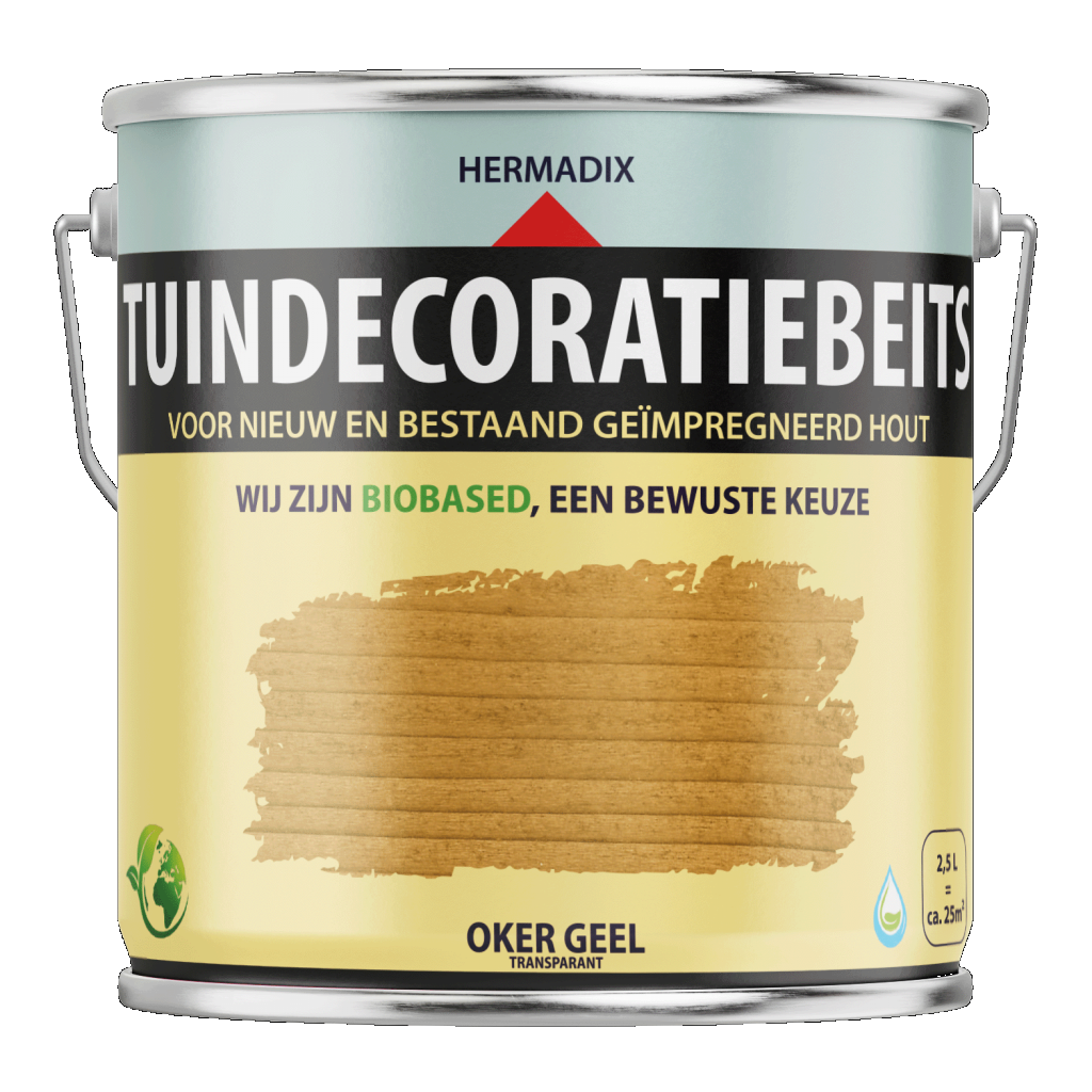 Hermadix Tuindecoratiebeits is speciaal ontwikkeld voor nieuw en oud geïmpregneerd tuinhout, zoals: schuttingen, speeltoestellen, borders, pergola en geïmpregneerde blokhutten. Nieuw geïmpregneerd tuinhout heeft een fabrieksmatige behandeling ondergaan. De speciale samenstelling van Tuindecoratiebeits is naadloos afgestemd op deze behandeling. Hierdoor kunt u uw tuinhout makkelijk en snel beitsen. Bij onderhoudslagen hoeft niet geschuurd te worden. Oker Geel is een transparante kleur en geeft een natuurlijke uitstraling waarbij de houtnerf zichtbaar blijft.